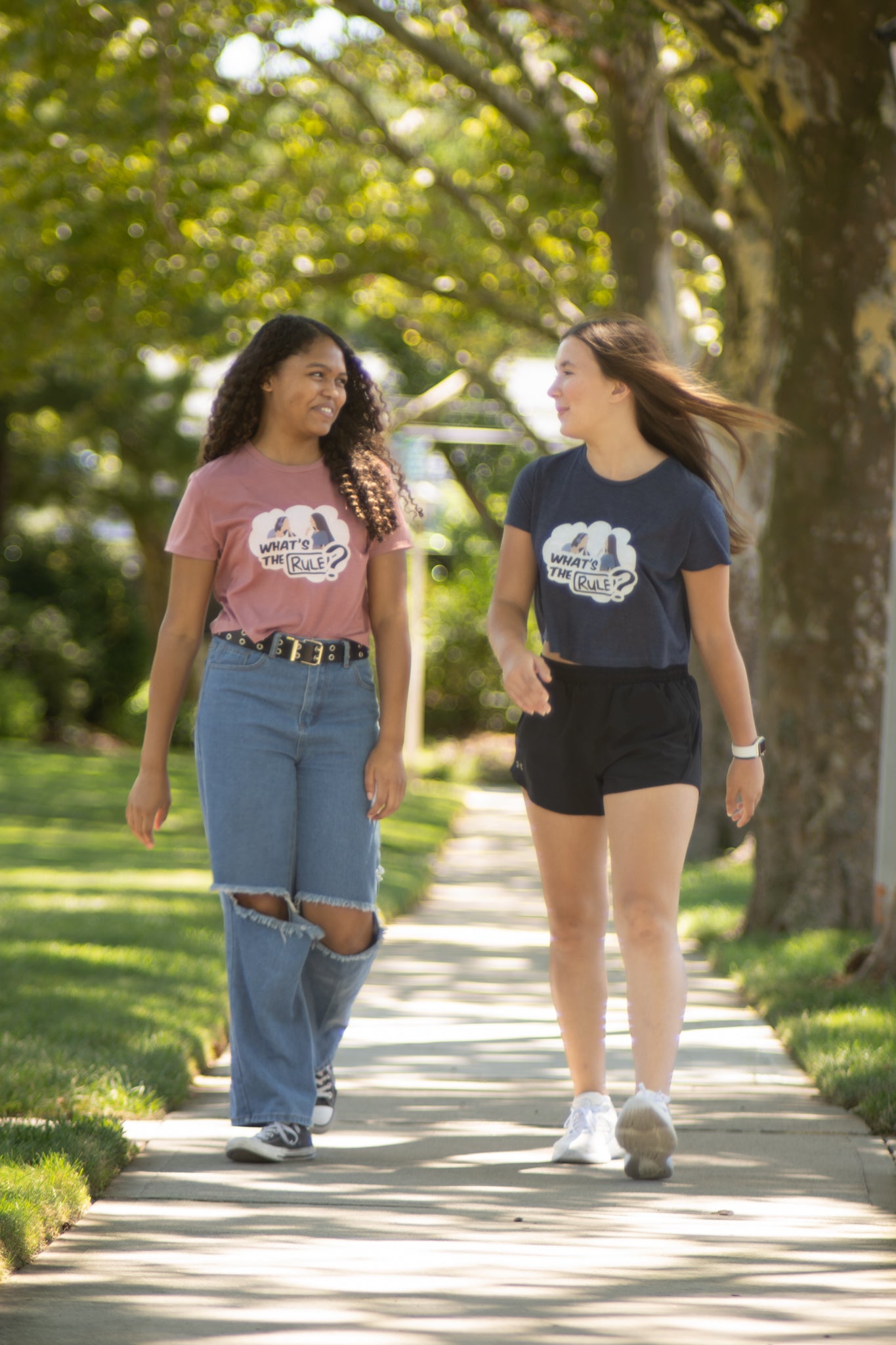 This Flowy cropped tee features our new What's the Rule logo alongside artwork of Sam and Jack designed by Jennifer McCue of Jnoelle Designs.